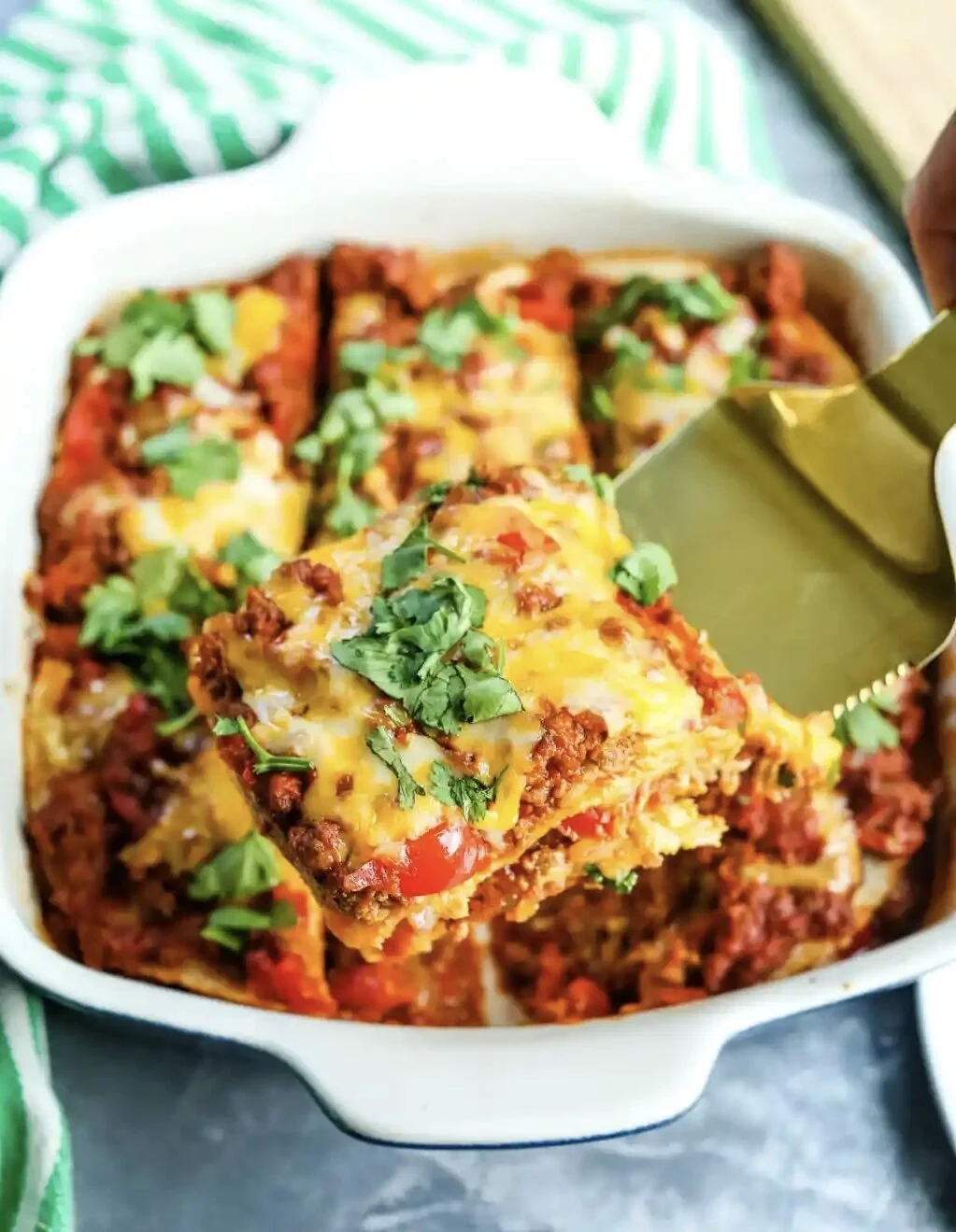 Grass fed taco beef, diced tomatoes, onion, garlic, cilantro and peppers, layered with corn tortillas and a bit of shredded cheese. Served with a side of cauliflower Spanish rice and house made salsa